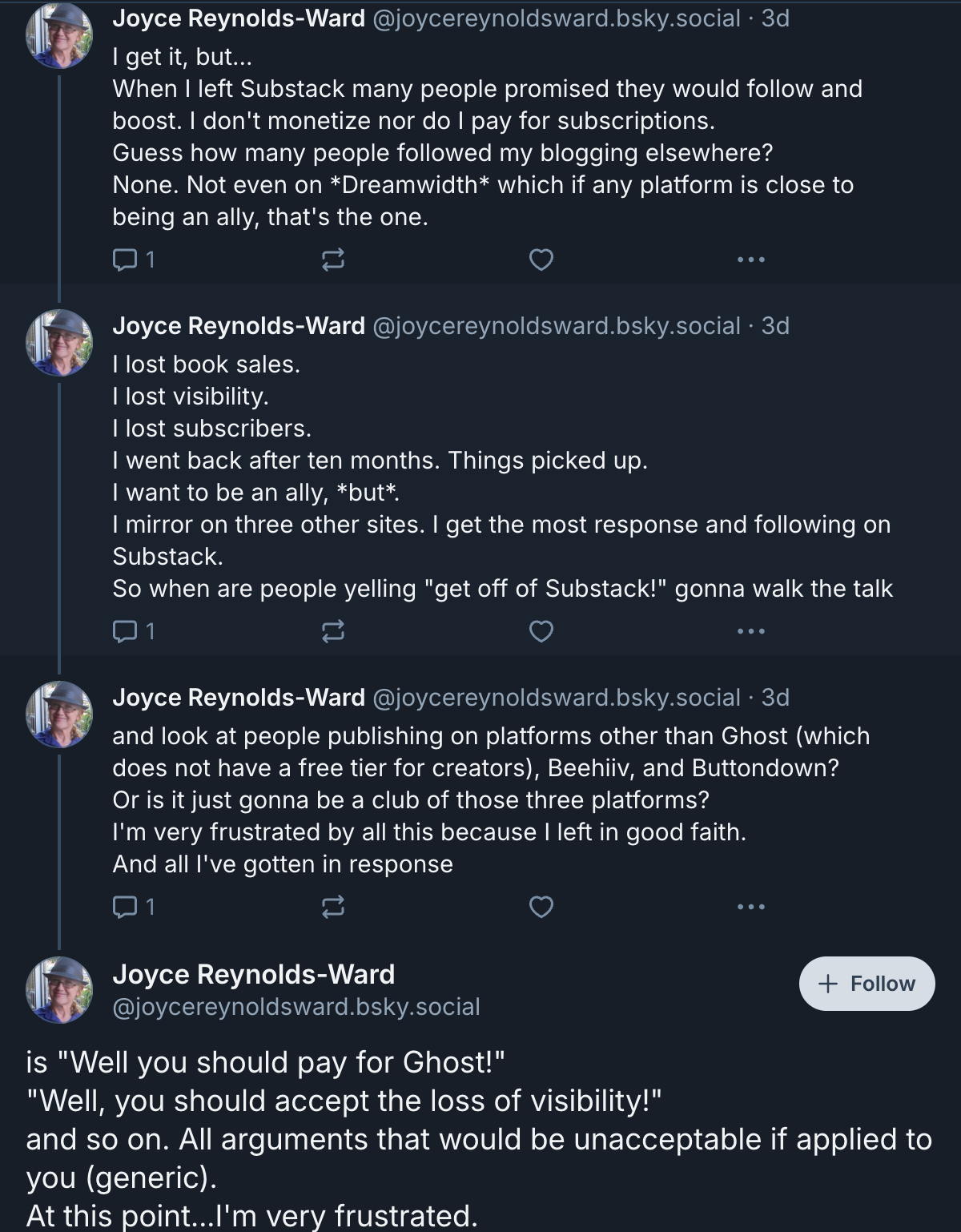 Not to worry, I've been doing this long enough that I will not lose my shit or get sucked into some fringe group simply because not enough people clicked a little "heart" on some dumb thought I had. I will also continue to post about my work on Bluesky and do the work needed to try and build my audience slowly. But if even I am feeling frustrated, that tells me we do need to pay attention to this. We can't just yell at people to leave Substack (or not join in the first place). We can't simply tell them it's easy to switch. We can't cajole them and then have no plan for them after they do so because they will be very mad and they will go back to Substack when they realize how much harder it is to build an audience. Don't believe me? Here's someone saying exactly this in my mentions (in response to someone else):