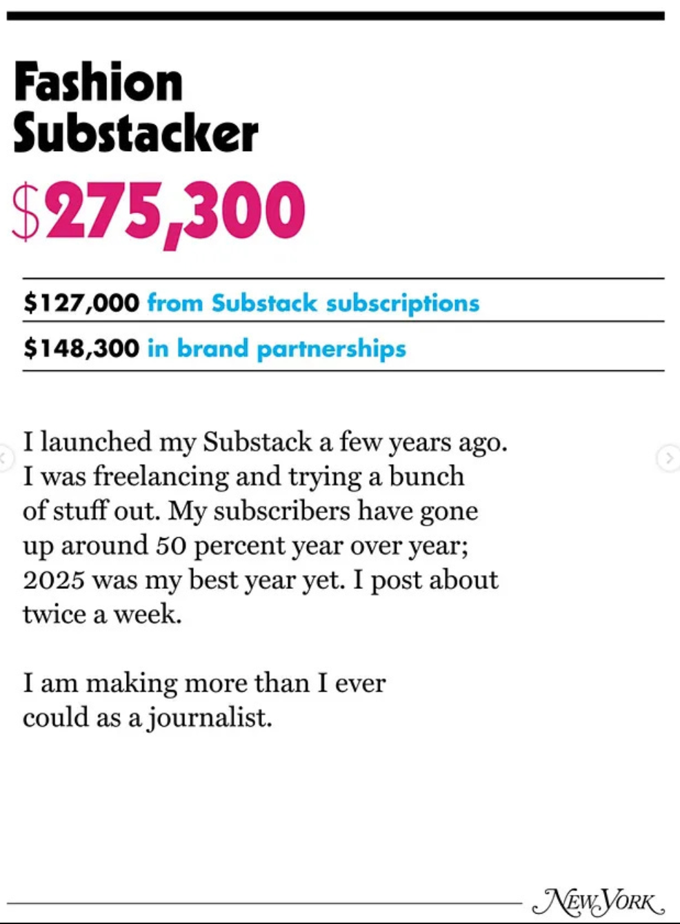 Last week there was a big kerfuffle over an article that appeared in New York Magazine. There were 60 different people in 60 different jobs, and the main question was "how much do you make?" Specifically, the kerfuffle was over this (anonymous) person and how much they made through their fashion newsletter on Substack.