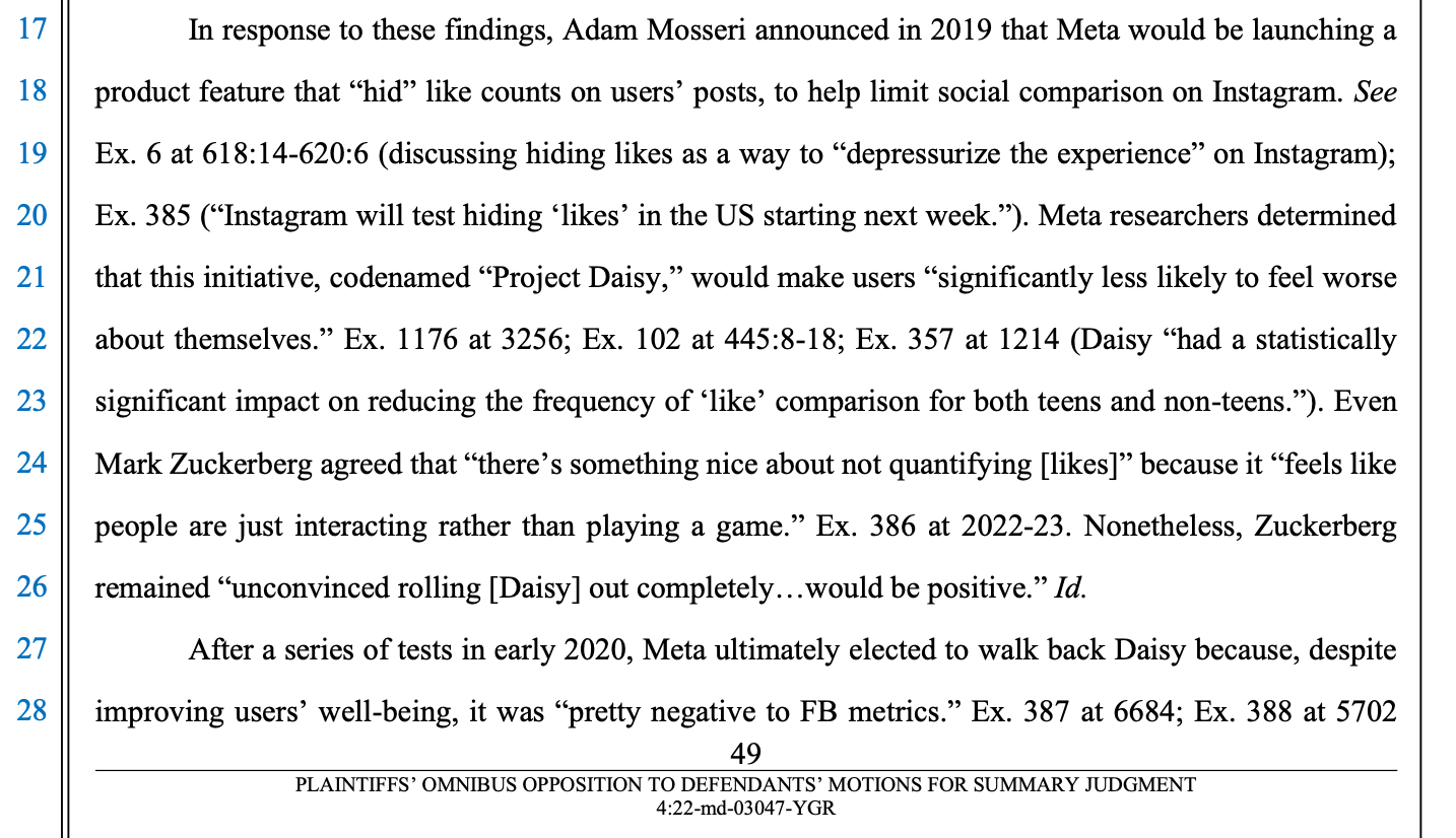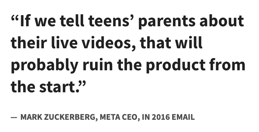Last week marked the beginning of one of the big consolidated social media trials that Meta, Snapchat, and TikTok will face this year. Some of you may remember me writing about one of these lawsuits last year, the one for which I was very nearly deposed. If you've read the news about this particular trial over the past few weeks, whether about the evidence found in discovery or the testimony provided by people like Adam Mosseri and Mark Zuckerberg, you might already be pretty angry. Based on everything I've seen in the news so far, the plaintiff's attorney is making Zuck and the other defendants look pretty bad. But to be honest, it's not that hard when you have evidence like this.