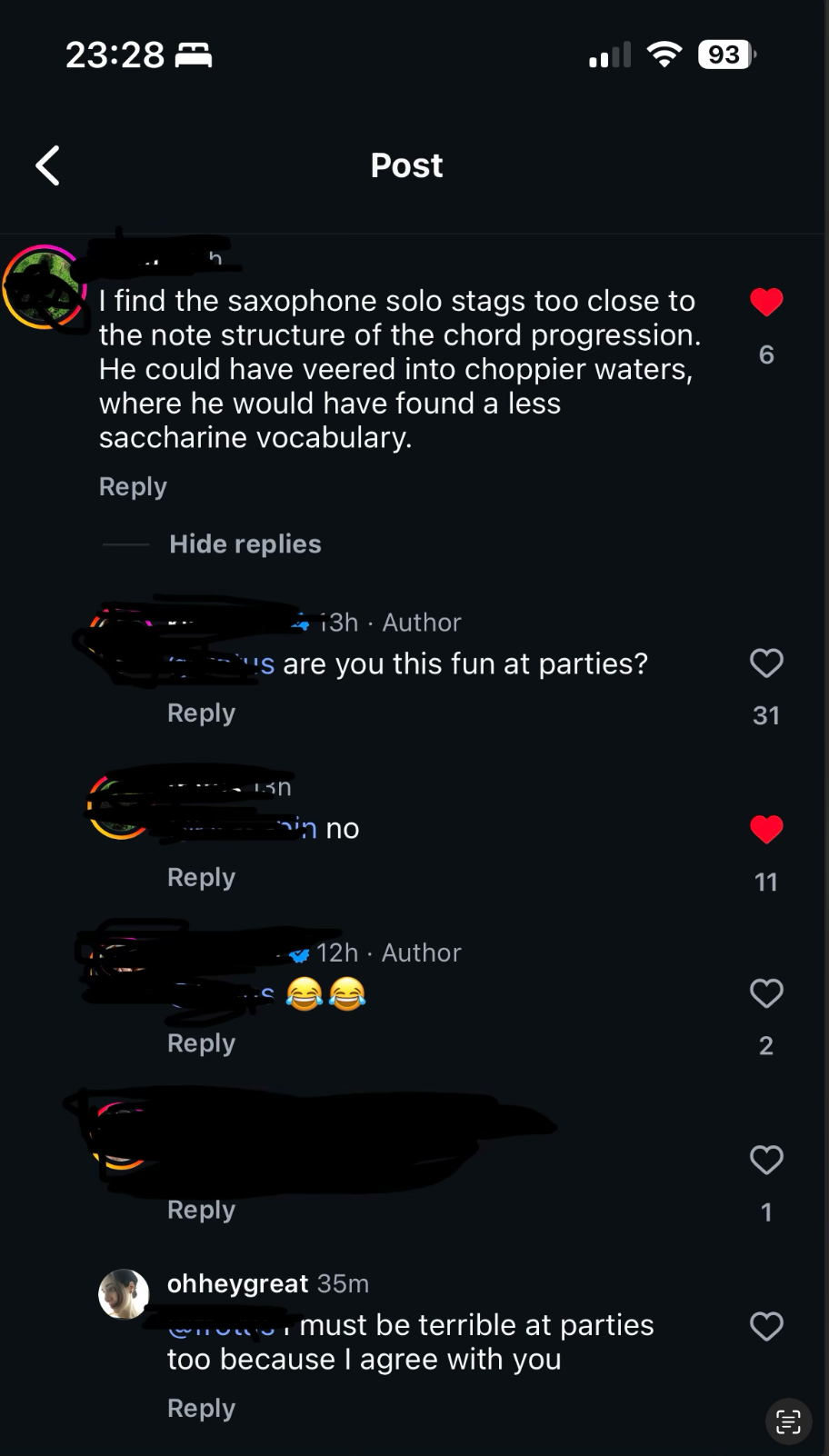 During all this, the original commenter followed me, so I followed them back and shot them a DM laughing about this weird interaction. Apparently after my second, longer response—which we both felt was extremely mild, or vanilla if you will—this commenter had said something else both complimentary and (again) mildly critical about the sax player. They'd also pointed out the fact that he was a hot young Gen Z guy playing romantic-sounding sax solos over music that Gen X now sees as "golden oldies," songs like "Linger" by The Cranberries (please kill me, I feel so old). And that's when she deleted our thread without responding to me again, and pinned her comment.