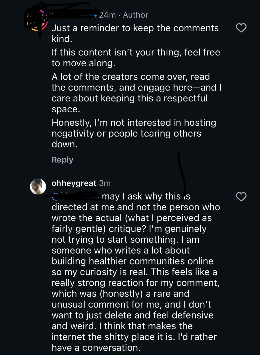 Look, a person absolutely has the right to manage and moderate (even police, if you want to call it that) the comments on their account or their newsletter or whatever. If this woman felt I was being negative or tearing people down, then what can I do? That's her prerogative. She doesn't have to let me comment, I don't have to follow her, there are plenty more memes in the sea.